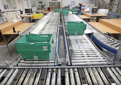 Celým skladem se vine válečkový dopravník s celkovou délkou přes 750 m. S jeho pomocí putují skladem plastové uzavíratelné přepravky s jednotlivými objednávkami, zároveň pomáhá i při zaskladňování zboží a s dopravou prázdných přepravek. Přepravky slouží zároveň jako distribuční obaly pro lékárny, při rozvozu předává řidič lékárnám plné přepravky s objednávkami a odebírá prázdné. Za den jich projde skladem zhruba 6 tisíc.